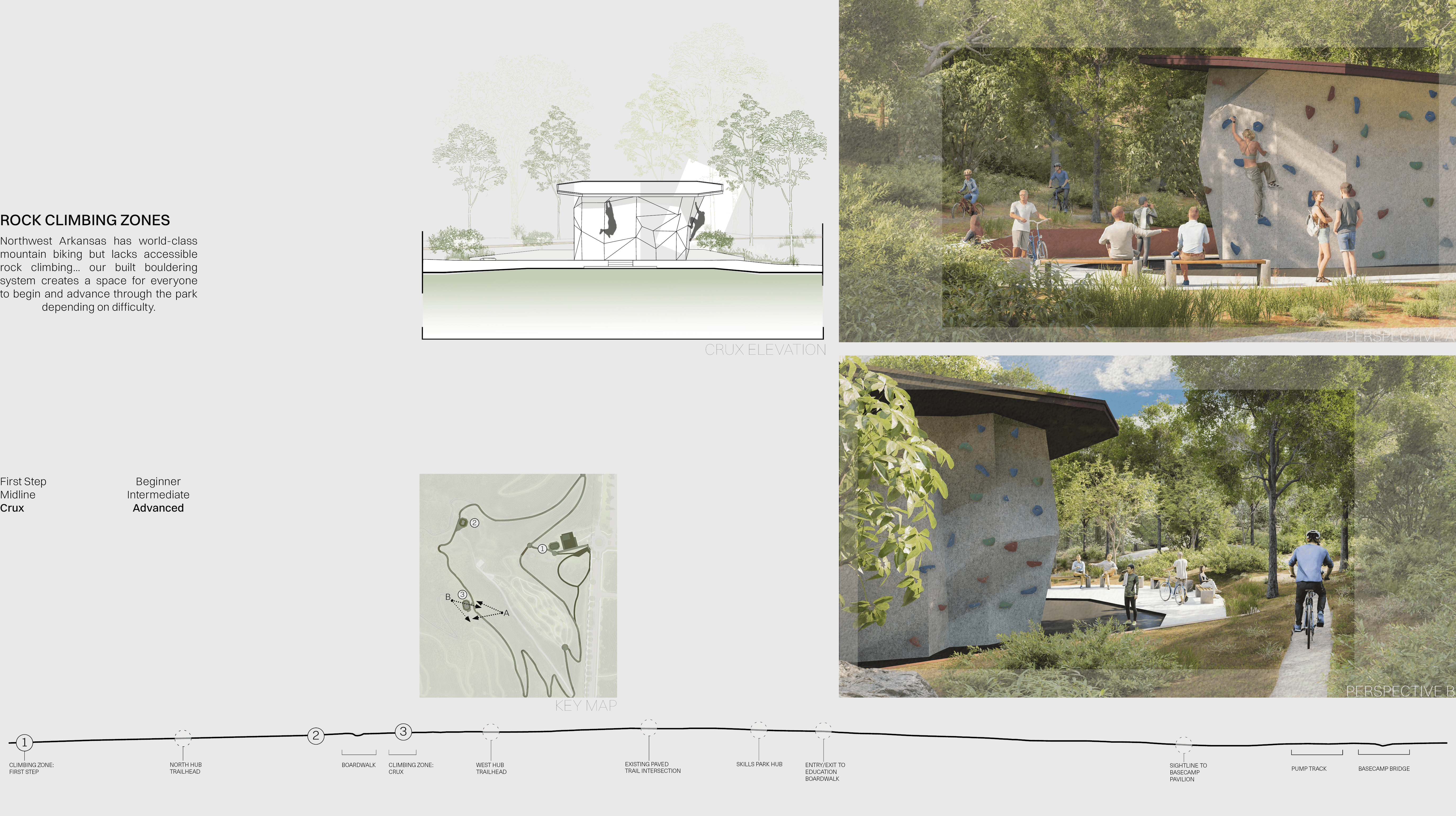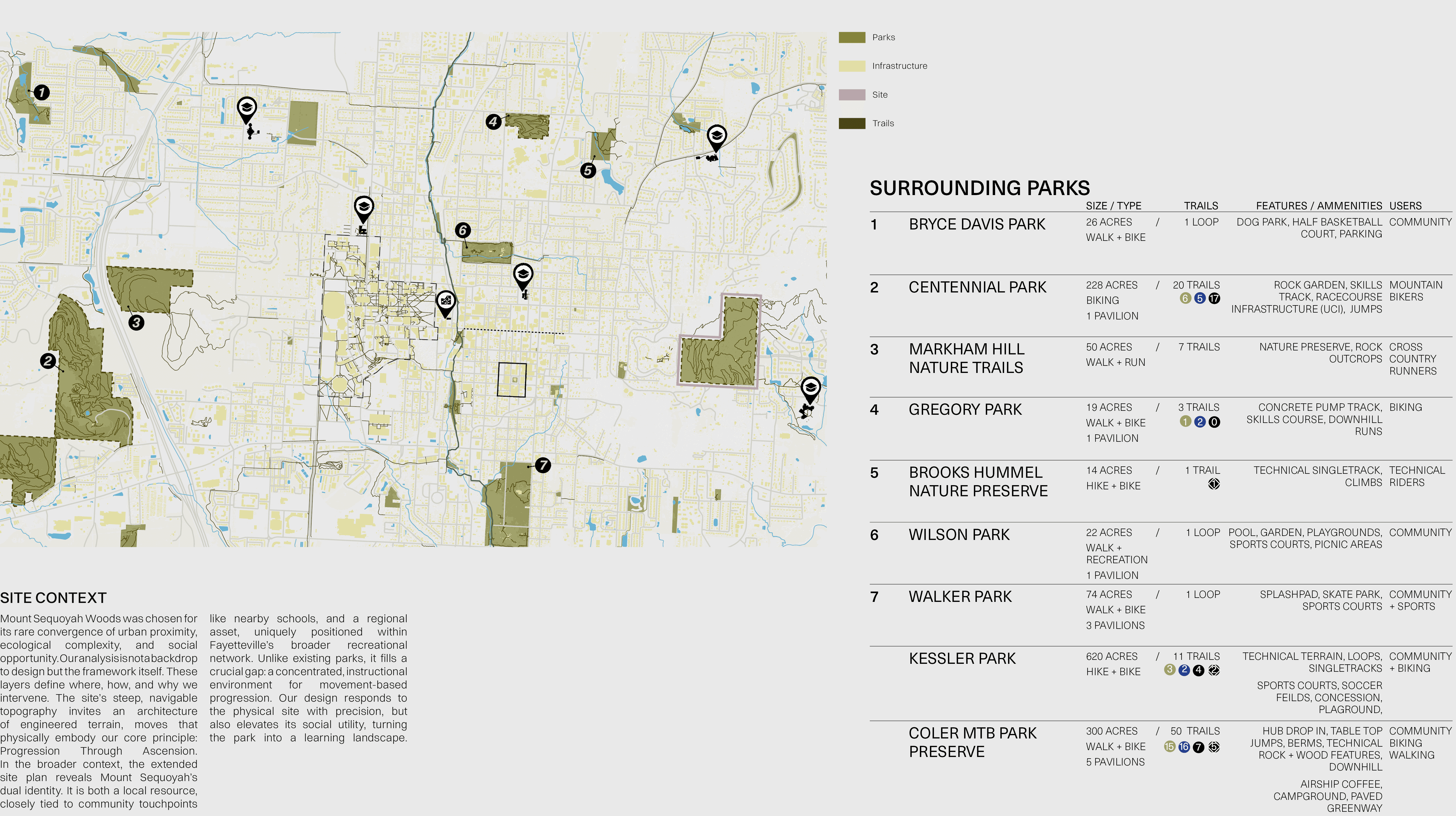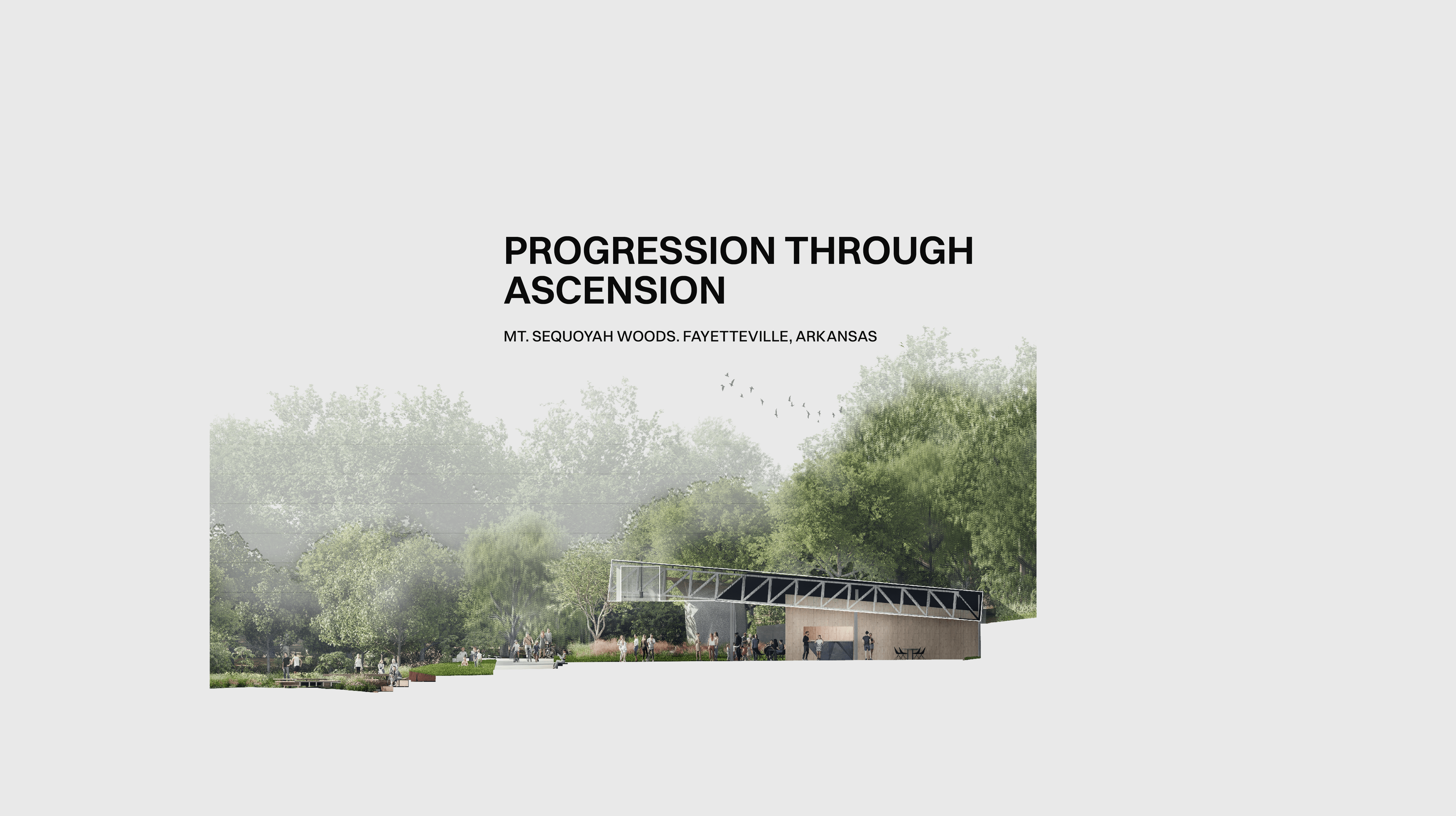 Progression Through Ascension reimagines Mt. Sequoyah Park in Fayetteville Arkansas as a place defined by movement, choice, and gradual growth. The project is built around the idea that progression can shape experience, using overlapping spaces, soft transitions, and flexible paths rather than a single prescribed route. Architecture and landscape work together to create moments for exploration, gathering, and pause, allowing visitors to engage with the site at their own pace. The design process focused on creating an environment where people define their own journey, reinforcing the belief that meaningful spaces are formed through freedom, interaction, and connection.