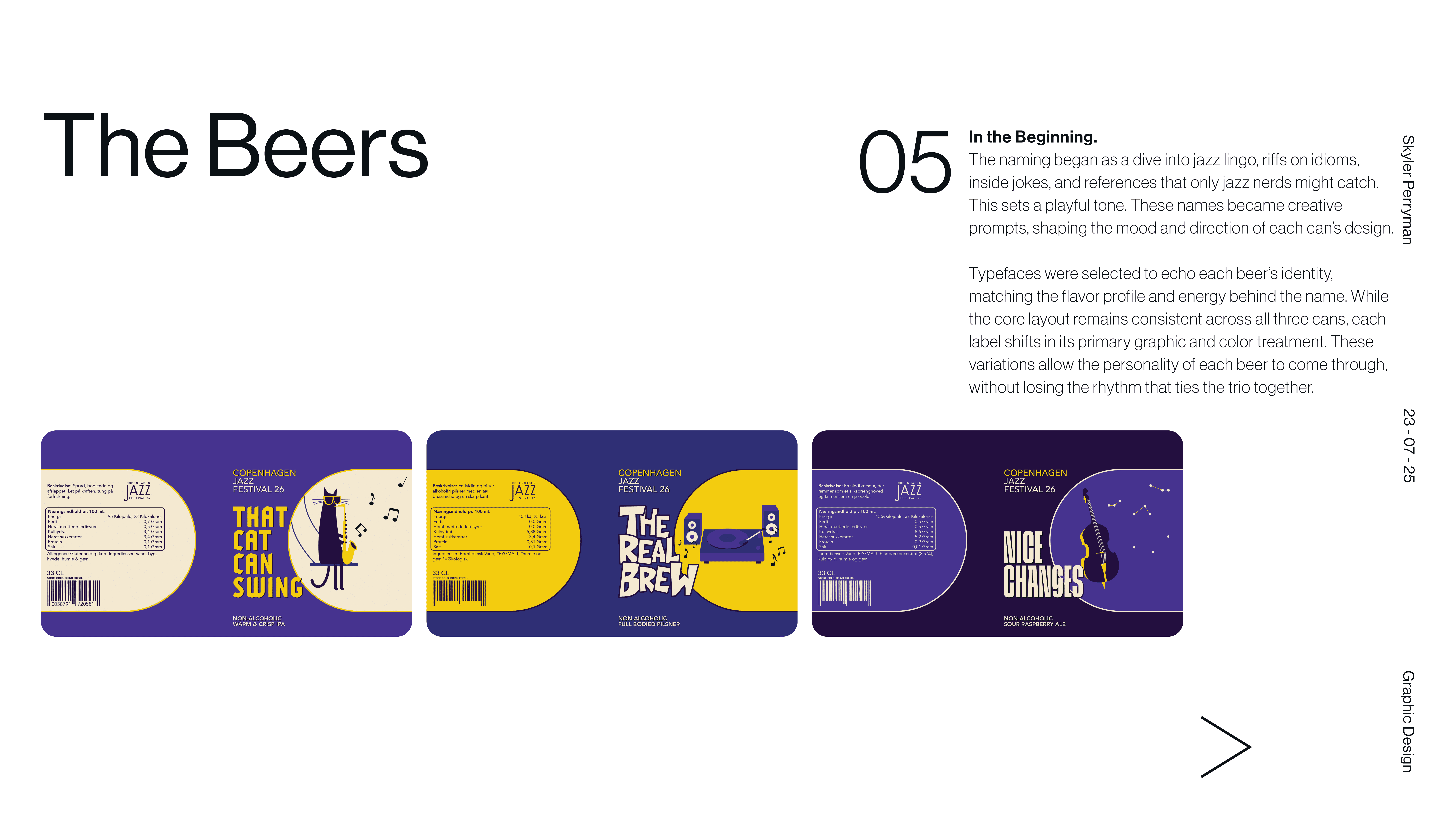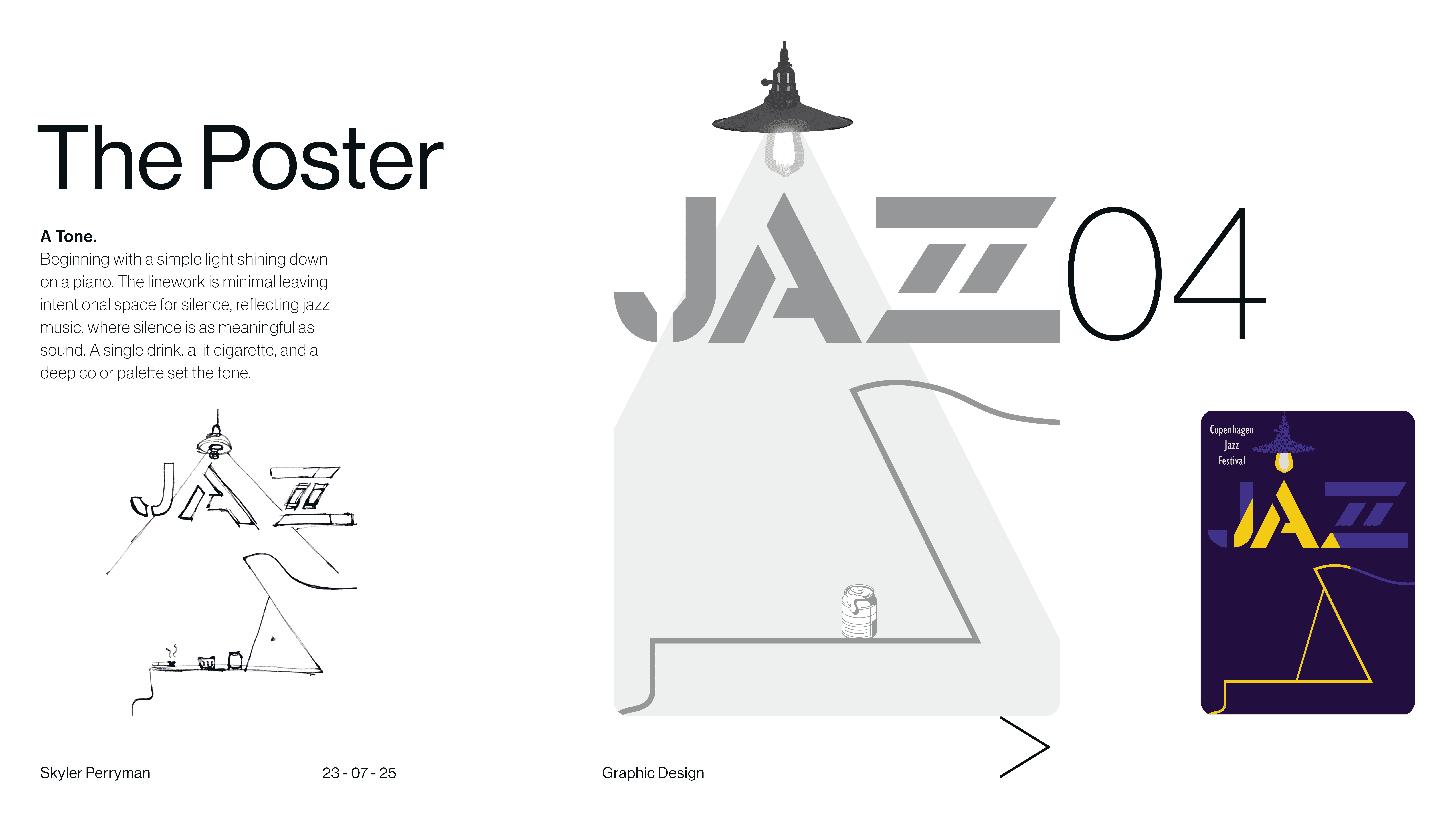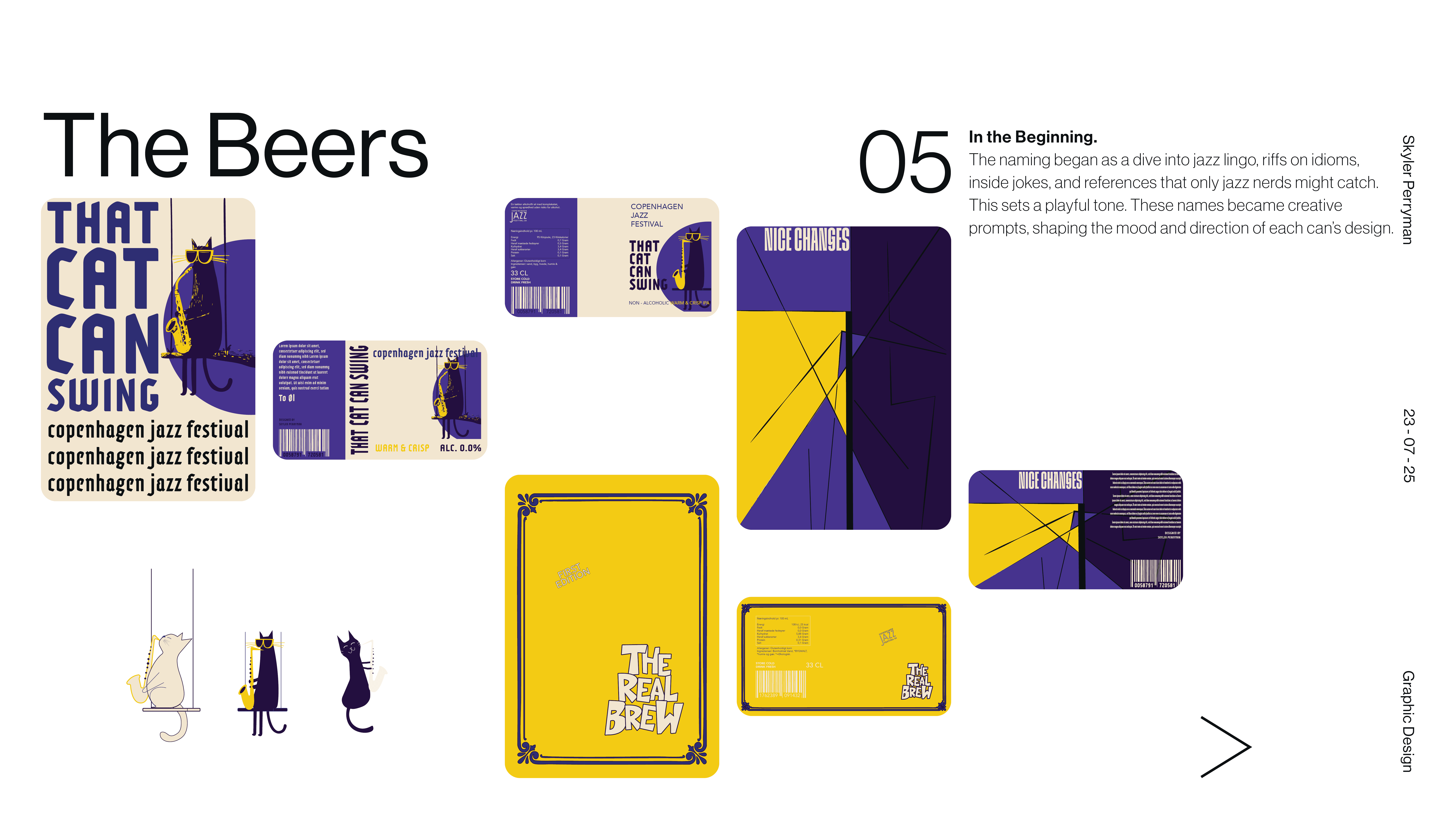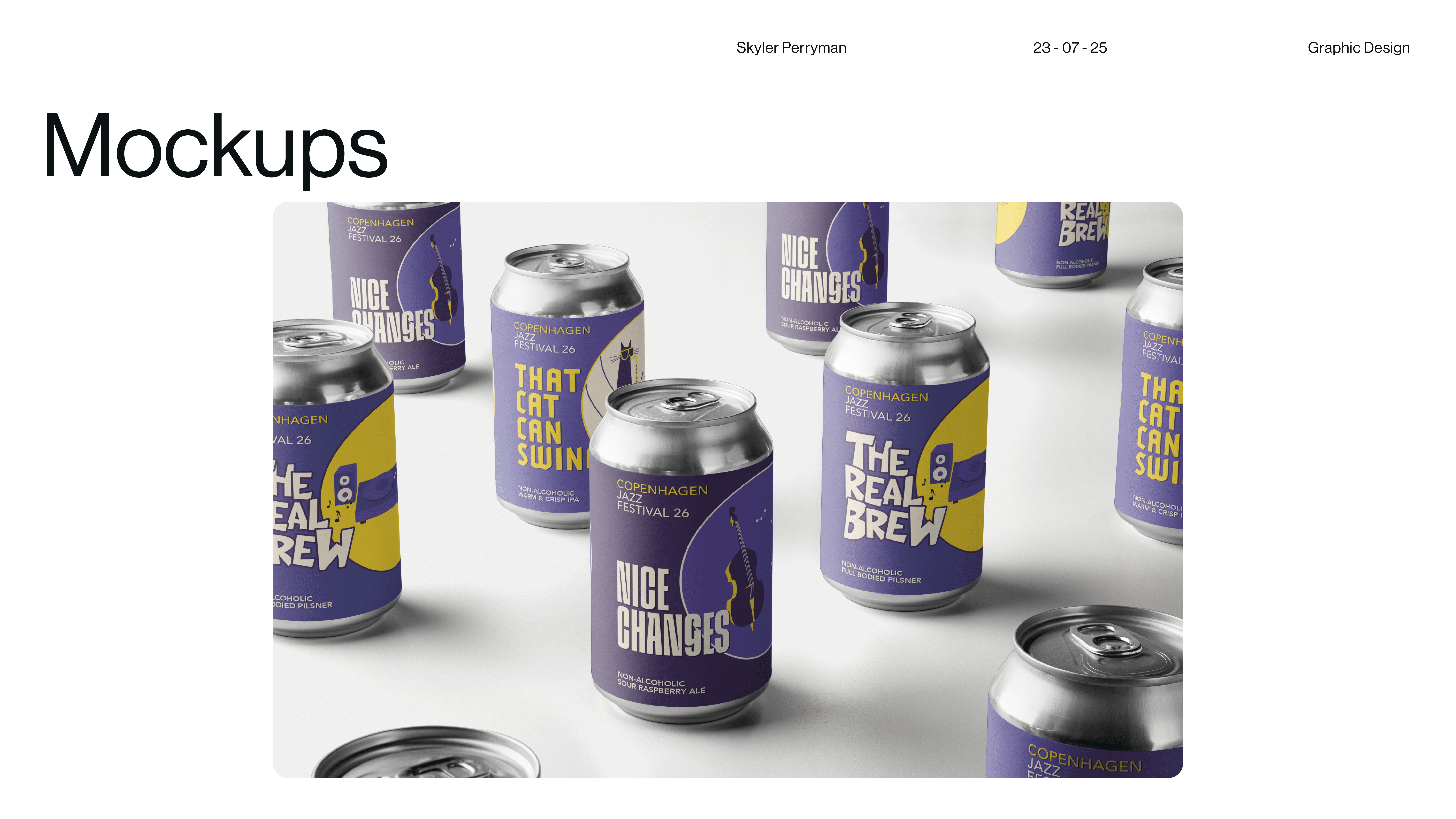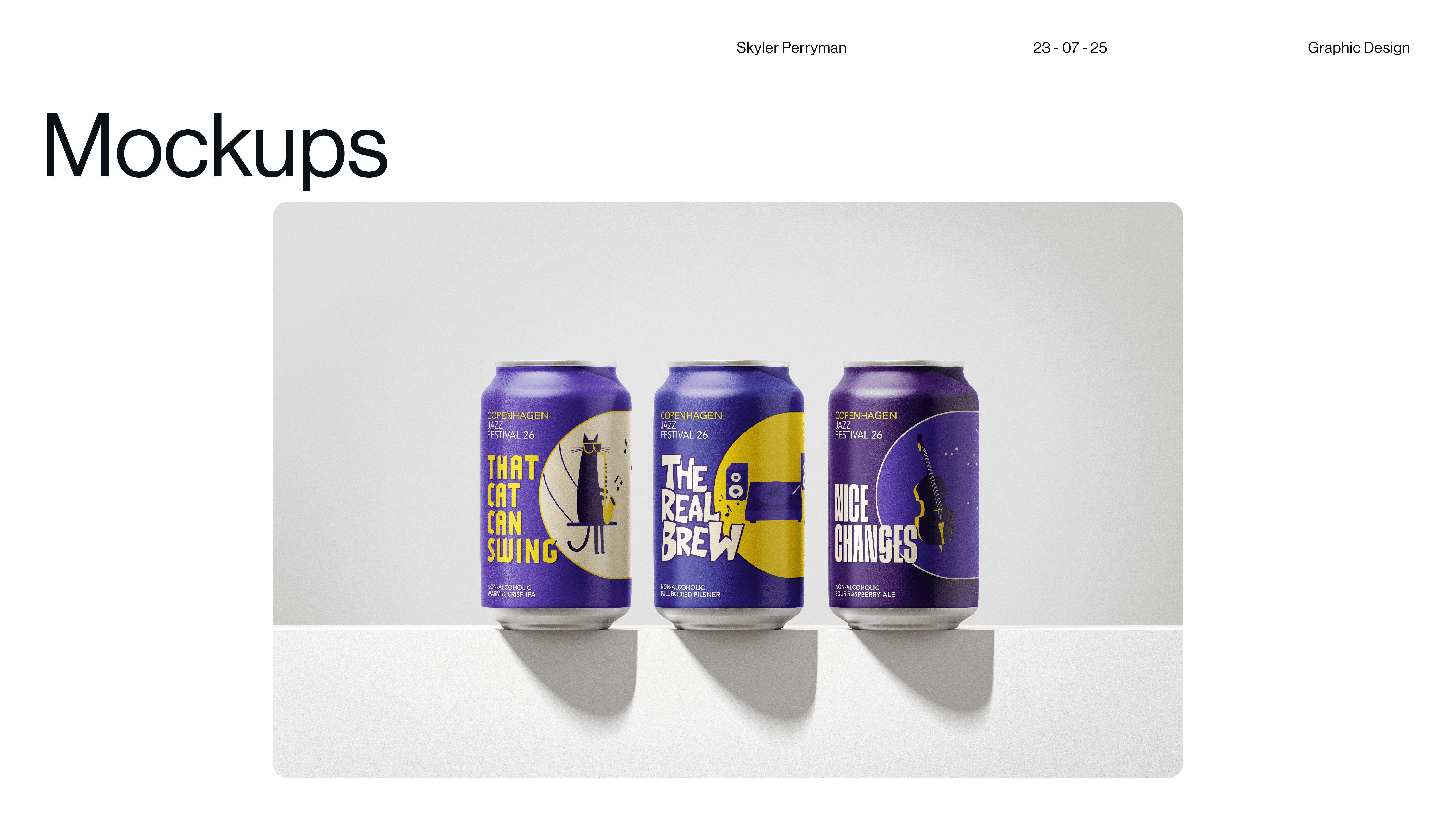Tipsy on Jazz is a branding and graphic design project that explores how visual identity can capture the looseness, rhythm, and spontaneity of live jazz culture. The main objective was designing 3 non-alcoholic beer cans. The work blends typography, expressive composition, and moody graphic moments to create a system that feels aligns with each of the flavors present in drink. Rather than relying on a single static mark, the identity operates as a flexible language, allowing text and color to shift while remaining cohesive. The result is a brand that feels social, inviting, and slightly off balance in the best way, reflecting the atmosphere of music, movement, and shared experience that defines jazz itself.